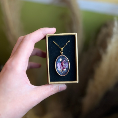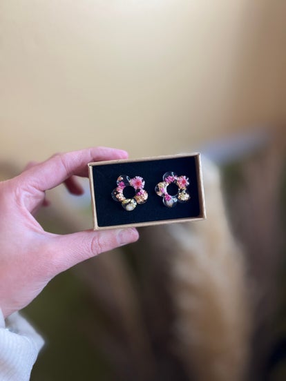 Résine, fleurs séchées, paillettes délicates et détails élégants se rencontrent pour donner naissance à des bijoux uniques, poétiques et féminins.